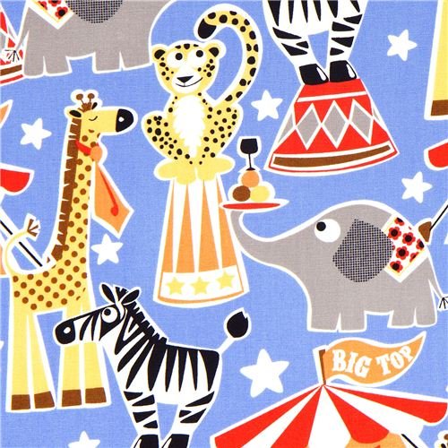 Tissu Michael Miller bleu et animaux sur piédestals .