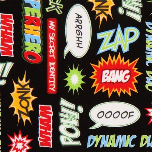 Tissu Robert Kaufman noir, super héros et bulles de dialogue (par 0,5 m multiples)