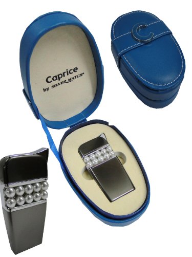 Briquet Femme rechargeable Caprice Ecrin cadeau Perle de culture Gris Fonce Metal 2 Rangs Perle de culture Dimensions 6,5x3cm Dans Ecrin Bleu simili cuir Surpiqures