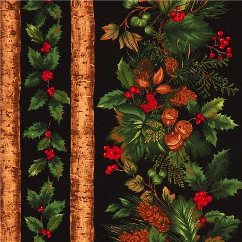 Tissu de Noël noir motif gui, pommes de pin, glands